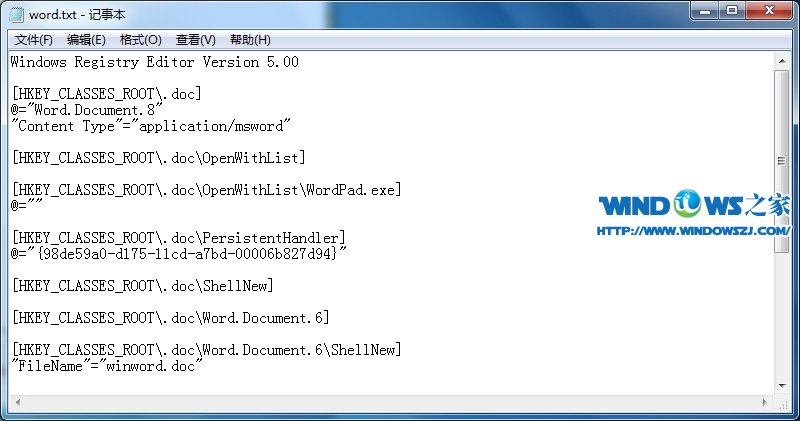 把文本文档另存为word.reg(一定要是reg后缀的,这样才是注册表文件),双击导入,然后重启电脑即可,如图一、二、三