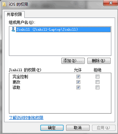 点击“权限”,设置你想要共享权限的用户完全控制,这样在Mac OS可以读和写操作,否则只能读
