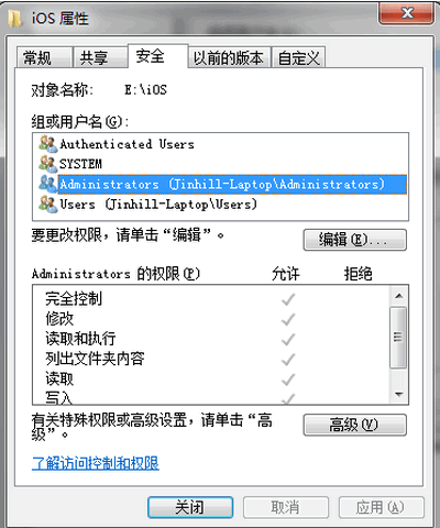 再设置文件NTFS权限,Jinhill用户所在Administrators组有完全控制权限