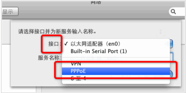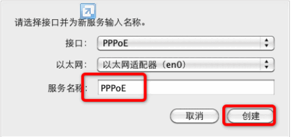 5.继续选择以太网,一般默认的就可以了,继续输入服务名称,其实什么名称都可以的,根据自己喜好来吧,我就把它命名为了PPPoE。然后点击创建。