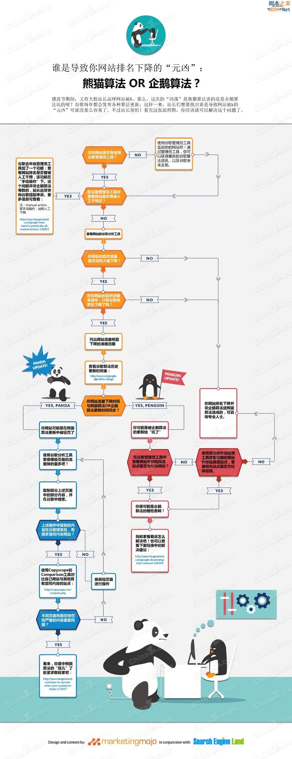 12月12日消息  近来,很多站长反映,感恩节期间网站排名出现较大变动,部分网站排名上升,另一部分网站遭遇被K命运。我们都知道,前段时间谷歌更新了企鹅算法(更新仍在继续)和熊猫算法。那么问题来了,网站被K现象到底是谁“害”的呢?企鹅算法 OR 熊猫算法?针对这个问题,国外SEO从业者Driscoll Miller带来了一张信息图,为我们解说到底是谁让你的网站排名下降了!