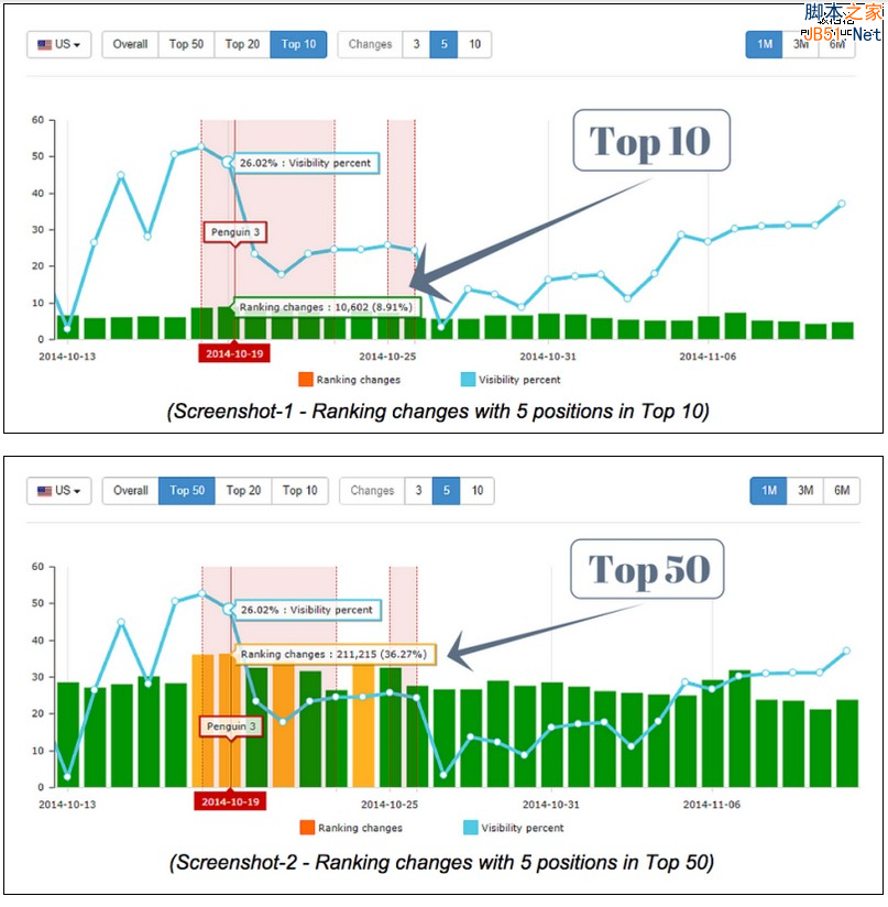 上图中的Overall部分就是通过特定算法计算得出的网站排名变化系数。而TOP 10-50部分表示与之前数据相比网站排名有浮动的站点数量、以及百分比(网站排名有受到影响的站点与所有网站的比例)。