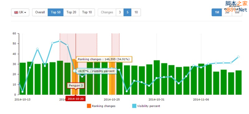 由于企鹅算法3.0是慢慢发布,其他地区、国家(除美国之外)发布时间稍晚于美国。比如英国谷歌搜索排名变动最显著的时间是在10月20日: