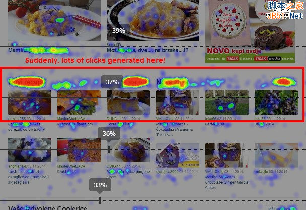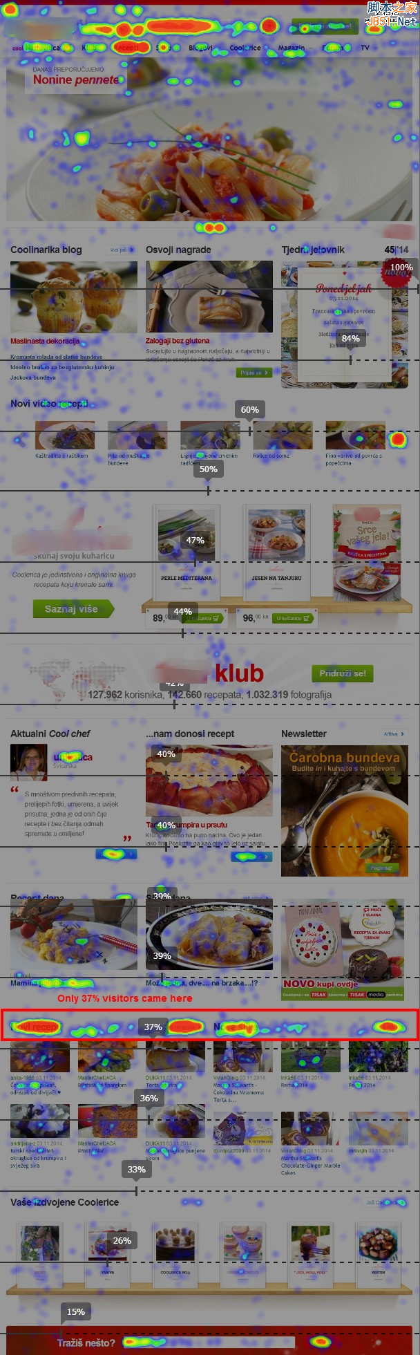 有几个很有吸引力的甜点食谱被放置于主页最下方,仅有37%的用户会将网页拖到这个位置看到它们。但是几乎所有看到这个食谱的用户都点击了它们,但是绝大多数的用户根本没几乎浏览到这里!设计师应该让这样的杀手级的内容置于最好的位置,不是吗?