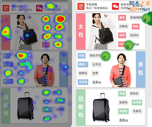 看看下面的例子吧。APP页面中,设计师使用了HOT等关键词来吸引潜在的用户的注意力,但是即便使用了粉红色来填充按钮,它的效果看起来也非常不明显。而男装部分,干脆使用了浅蓝色,这个地方的点击量就更少了。我们可以理解设计师的苦心,但是对于用户,它一点也没有吸引力。