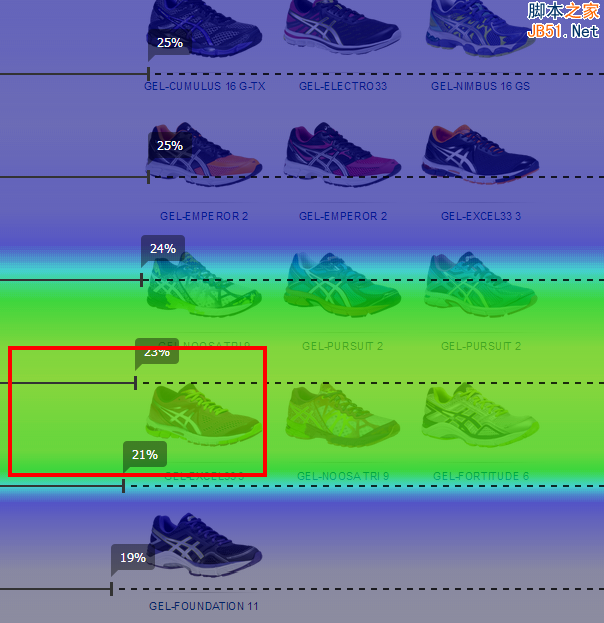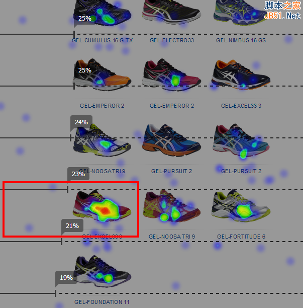 几乎相同的情况也发生在运动品牌Vendor的网页上。许多不同类型的鞋被放置在整个长页面上,设计师真的应该梳理一下那些鞋比较吸引人。只有20%的用户会浏览到页面底部,但是几乎所有浏览到这里的用户都会点击那双鞋,这足以证明它非常吸引人,那么为何不将它挪到用户更容易发现的地方呢?