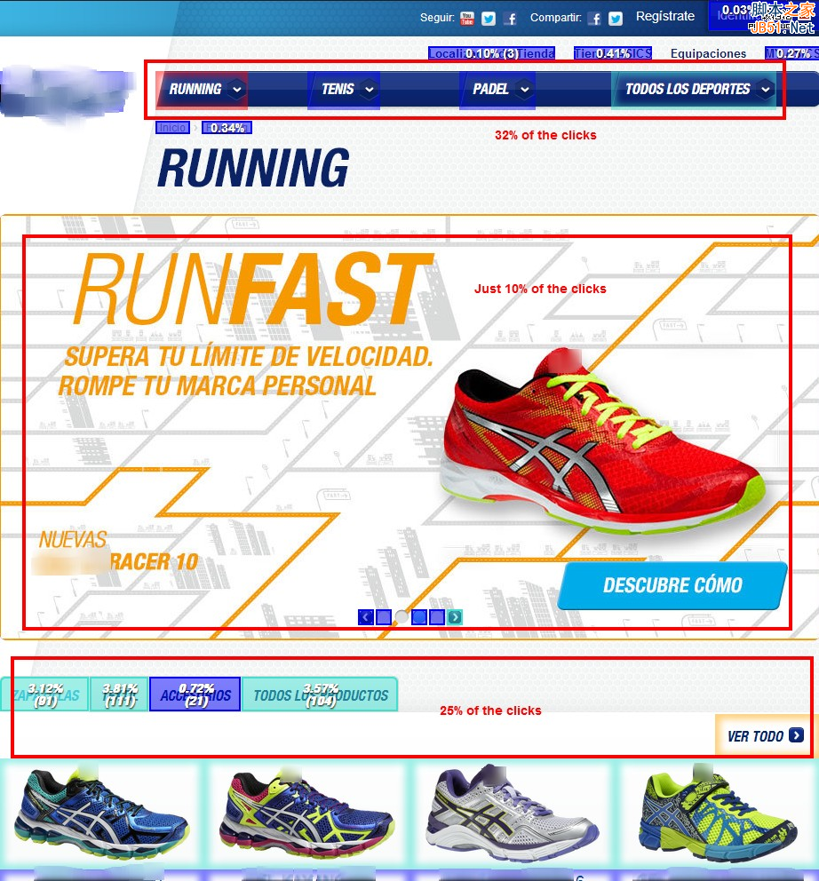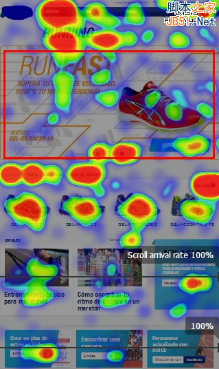 许多网站都喜欢在网站的导航栏下顶部的位置放上巨大的Banner,宣传主打产品或者主要的服务。一旦使用了这样的设计就意味着网站顶部大部分都会被一张图所填充,用户的注意力会被它所吸引,然后才是让用户注意到下方的其他产品。下面的这张热点图是最大的体育品牌Vendor的鞋类产品页面,我们发现他们顶部的Banner的点击率并不高,仔细分析数据之后发现大概占据了页面总点击量的10%,很明显多数用户看了这个图之后并未被其吸引而是选择向下浏览他们自己真正喜欢的鞋。