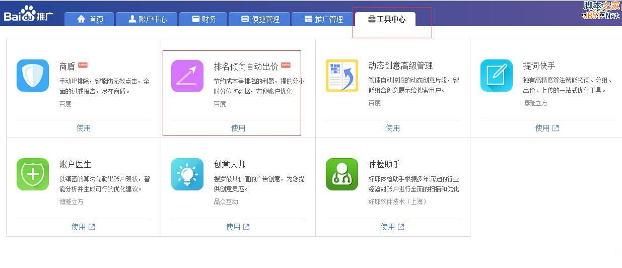 登陆百度推广,点击 搜索推广——工具中心——选择排名倾向自动出价,点击使用,便可进入。