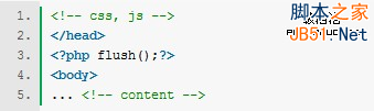 用户端发送浏览请求后,服务器端一般要花销200-500ms去处理这些请求,在此期间,用户端浏览器处于等待状态,如果要减少用户等待时间,可以在适当的位置使用flush,将已经就绪的内容推送到用户端,这在php中很容易实现例如: