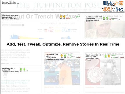 下图中对赫芬顿邮报的点击率情况从2小时到昨天都有进行追踪,并绘制出趋势曲线,对于不具备病毒传播特点的内容及时进行调整,或提升或降低版面位置,甚至删除。