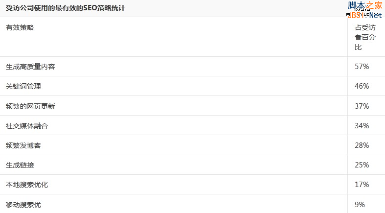 调查显示,“如果你的企业不再搜索结果的首页出现,那么你就等同于不存在。”为此,企业的最高管理层都把他们的目光投向了搜索引擎排名。57%的市场销售专业人士表示生成高质量的内容是SEO(搜索引擎优化)最有效的策略。