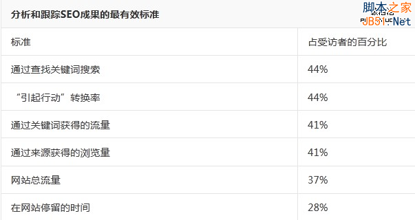 Ascend2在2014年4月开展了一项以全世界范围内442个市场营销专家(其中美国的占63%,欧洲的占16%,加拿大占6%,其他地区的占15%)为样本的关于搜索引擎优化的调查。