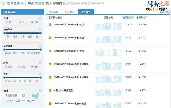 淘宝指数还显示了购买过“实木床”的消费人群偏好,老板A嘴里念念有词,“橡木、松木、桦木、欧式、简约现代... ...”